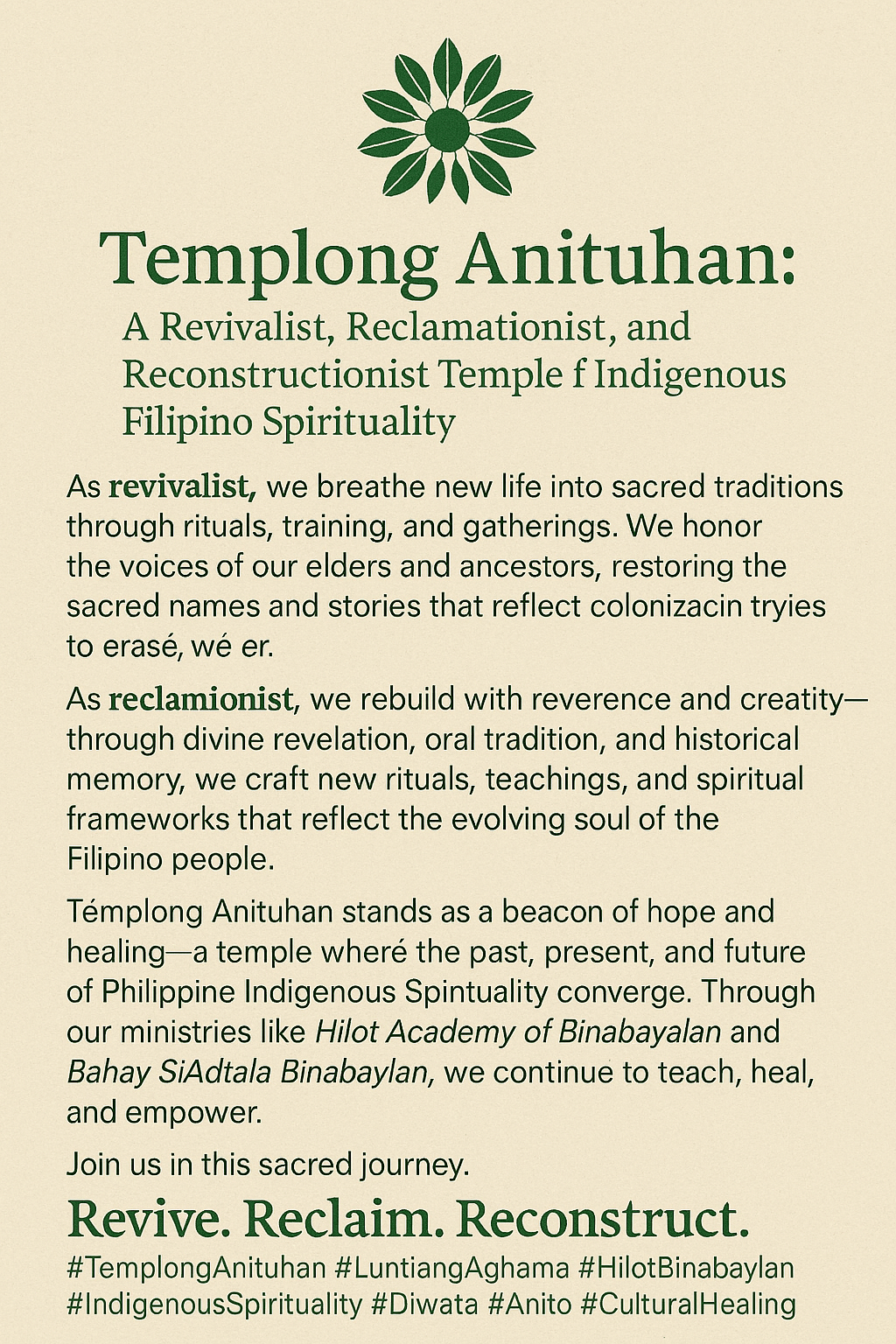 Templong Anituhan ng Luntiang Aghama is more than just a temple—it is a living movement of spiritual awakening, cultural healing, and ancestral remembrance.